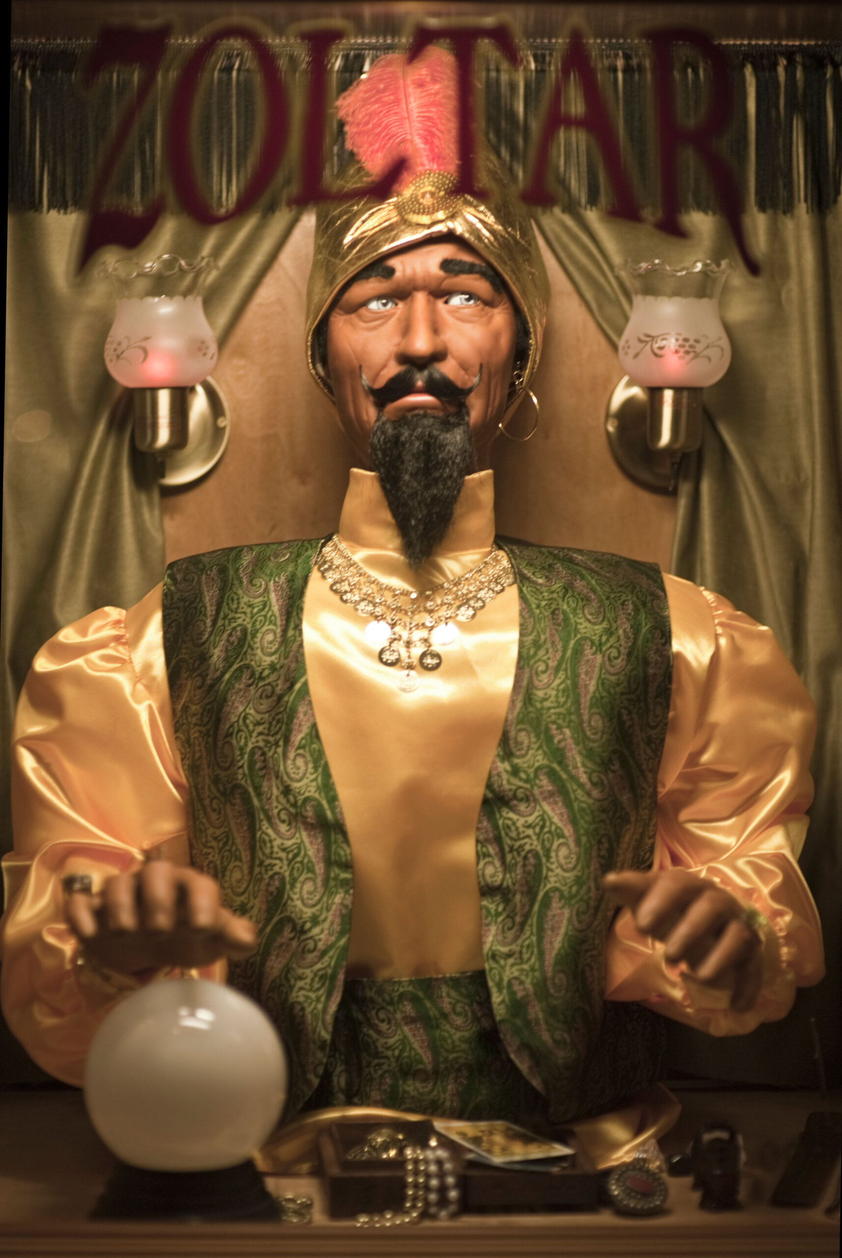 BK83PH // Fortune teller in costume in a mechanical fortune telling machine with crystal ball. // Michael Honegger