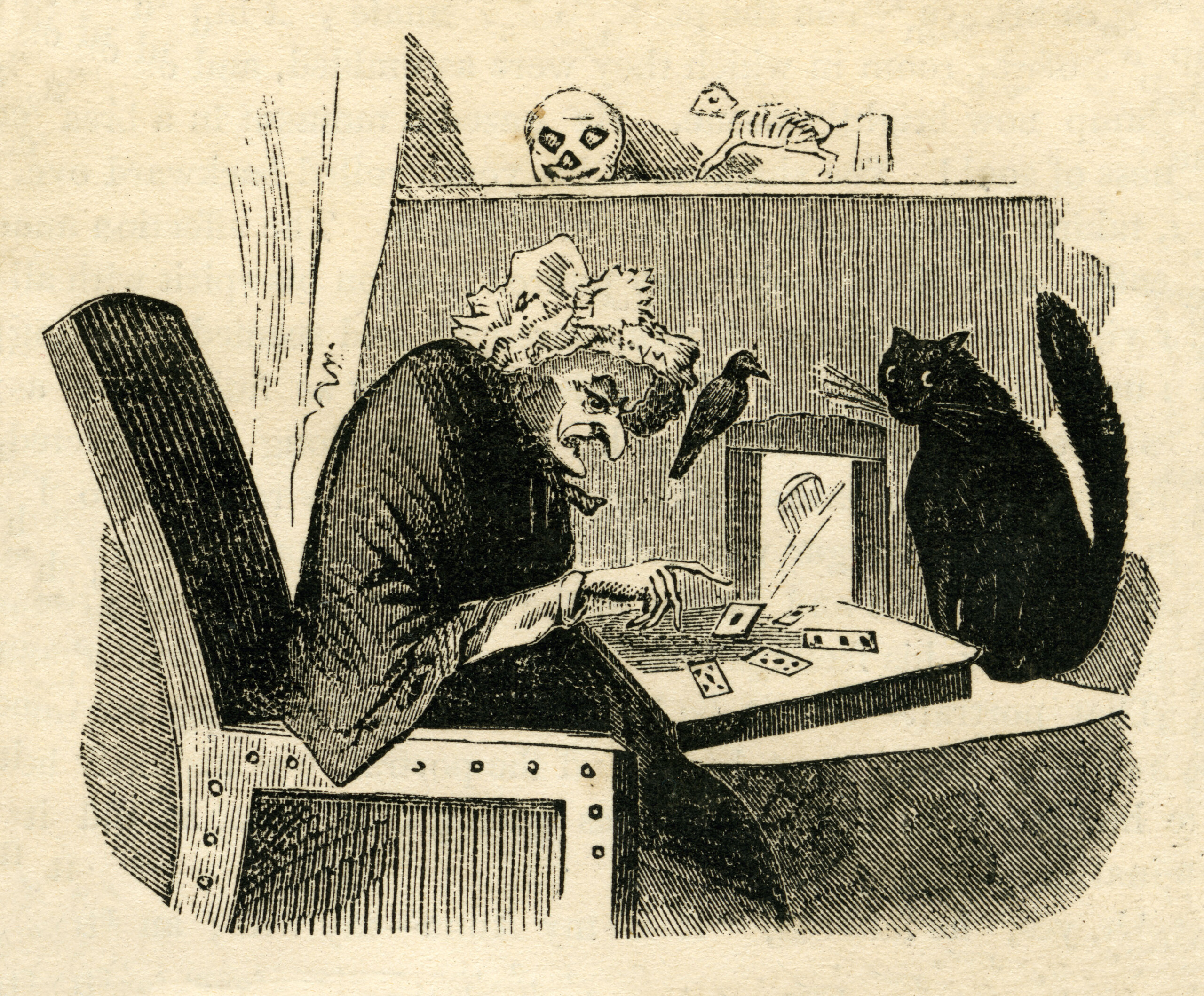 CBY0T5 // 1854 engraving, witch fortune teller and black cat. Image shot 1854. Exact date unknown. // Old Paper Studios