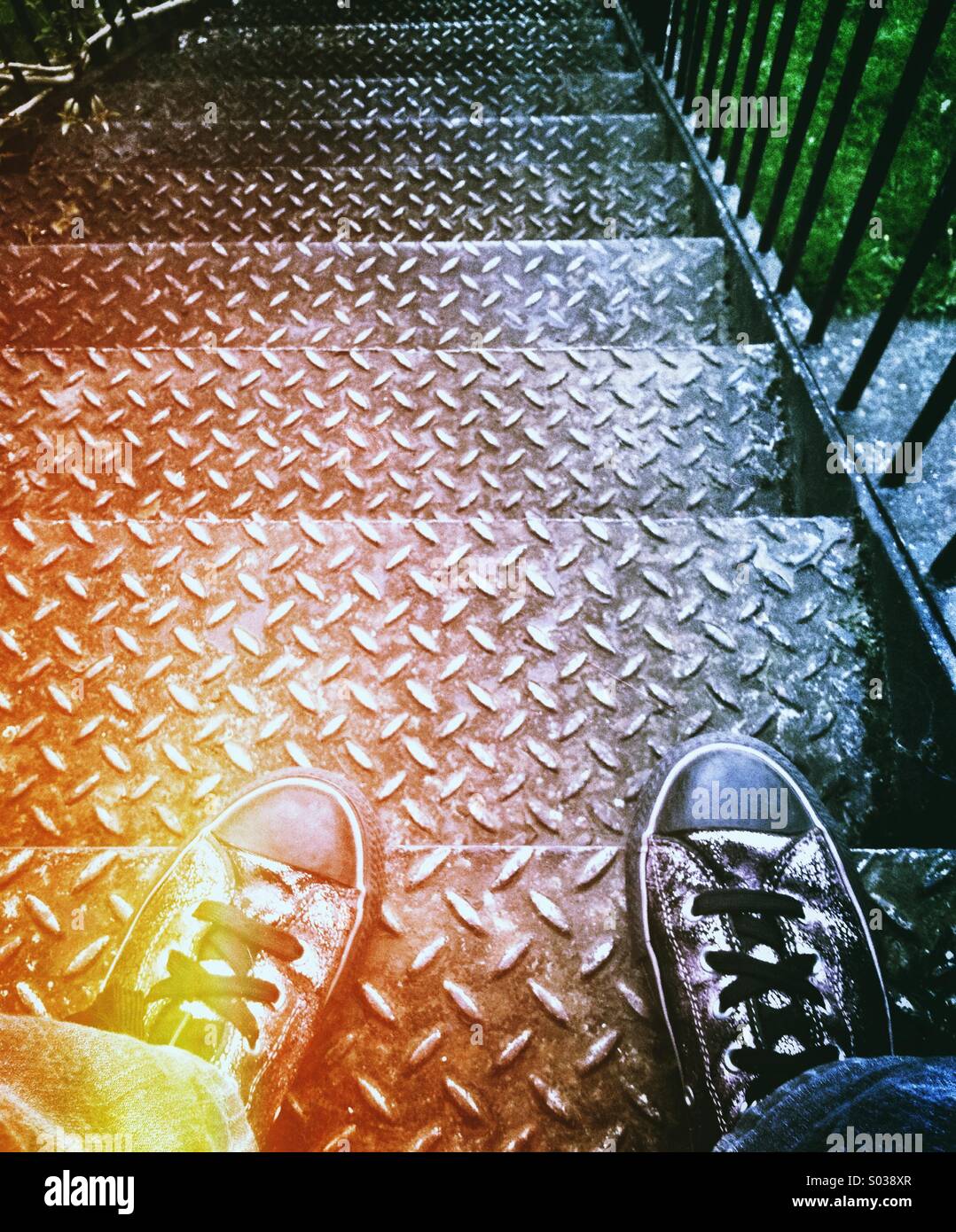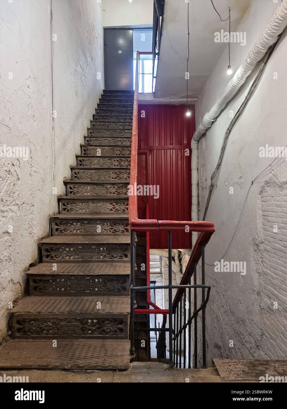 Old narrow metal interior stairs towards door; can be used as concept (upstairs, to the top, entry at the top, path, many steps, the way up, etc.) - Smartphone Captured Stock Imagehttps://www.alamy.com/image-license-details/?v=1https://www.alamy.com/old-narrow-metal-interior-stairs-towards-door-can-be-used-as-concept-upstairs-to-the-top-entry-at-the-top-path-many-steps-the-way-up-etc-image644112221.html
