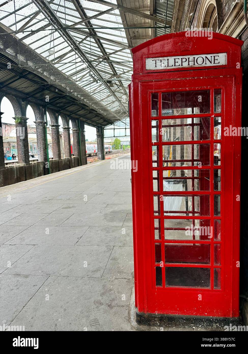 Vintage red phone box on platform at Chester train station with empty platform and ornate iron and glass roof. 17 May 2025. Editorial use only. - Smartphone Captured Stock Imagehttps://www.alamy.com/image-license-details/?v=1https://www.alamy.com/vintage-red-phone-box-on-platform-at-chester-train-station-with-empty-platform-and-ornate-iron-and-glass-roof-17-may-2025-editorial-use-only-image678562400.html