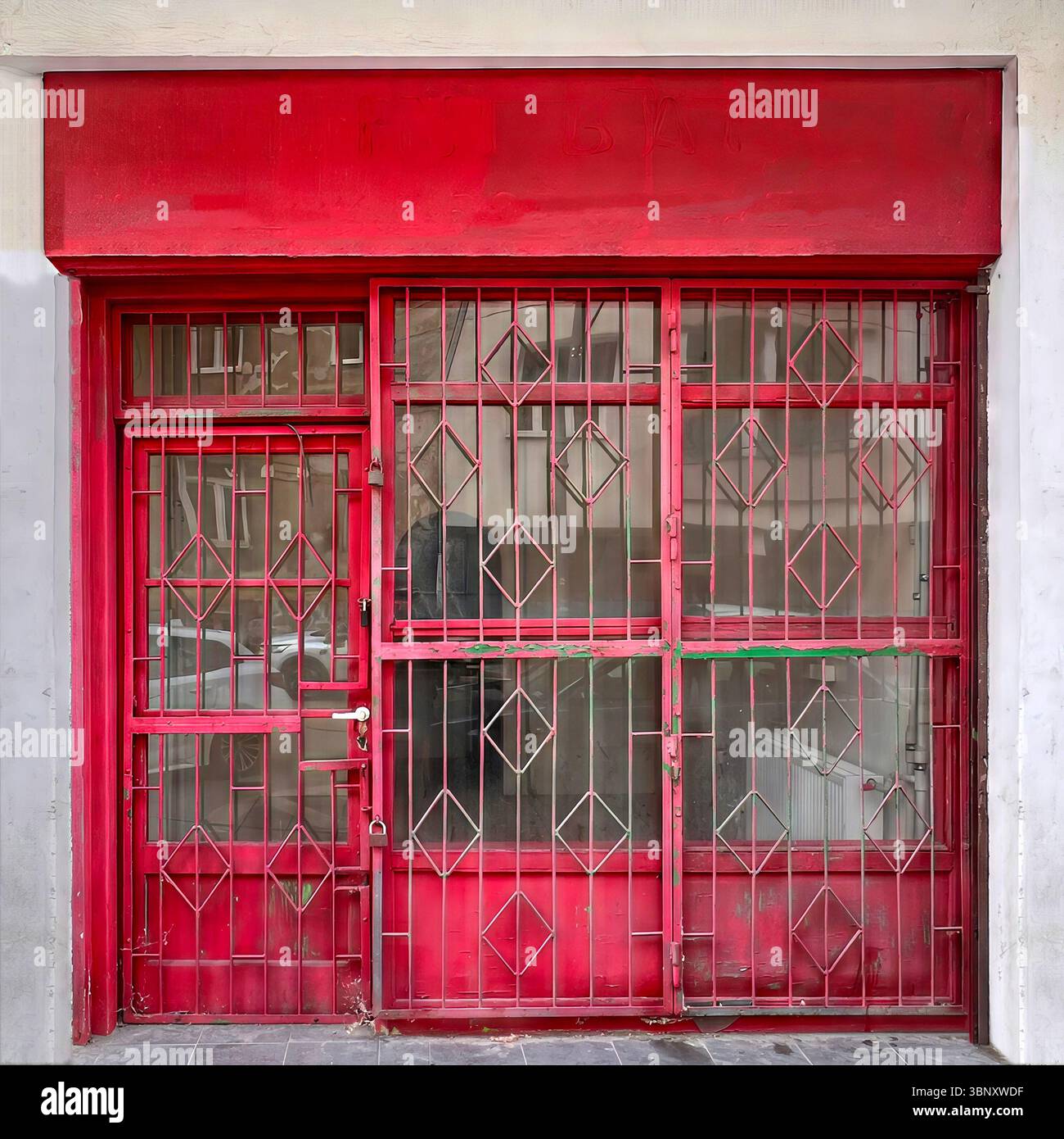 Faded red storefront with geometric metal grates hints at a forgotten past on a quiet Warsaw street. - Smartphone Captured Stock Imagehttps://www.alamy.com/image-license-details/?v=1https://www.alamy.com/faded-red-storefront-with-geometric-metal-grates-hints-at-a-forgotten-past-on-a-quiet-warsaw-street-image684702859.html