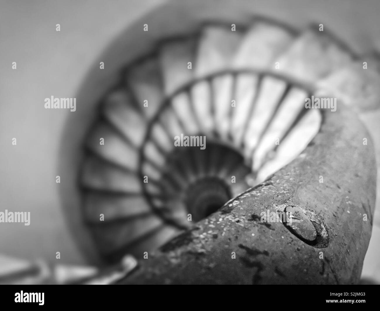 Black and white ancient spiral staircase. Focus on the iron handrail - Smartphone Captured Stock Imagehttps://www.alamy.com/image-license-details/?v=1https://www.alamy.com/black-and-white-ancient-spiral-staircase-focus-on-the-iron-handrail-image311427203.html