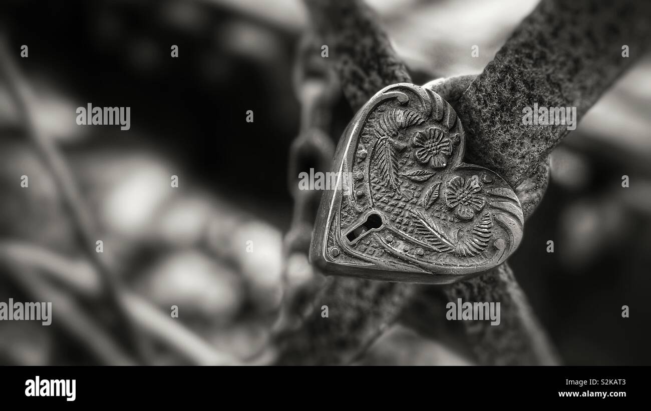 RFS2KAT3–Ornate heart shaped love lock on trestle bridge