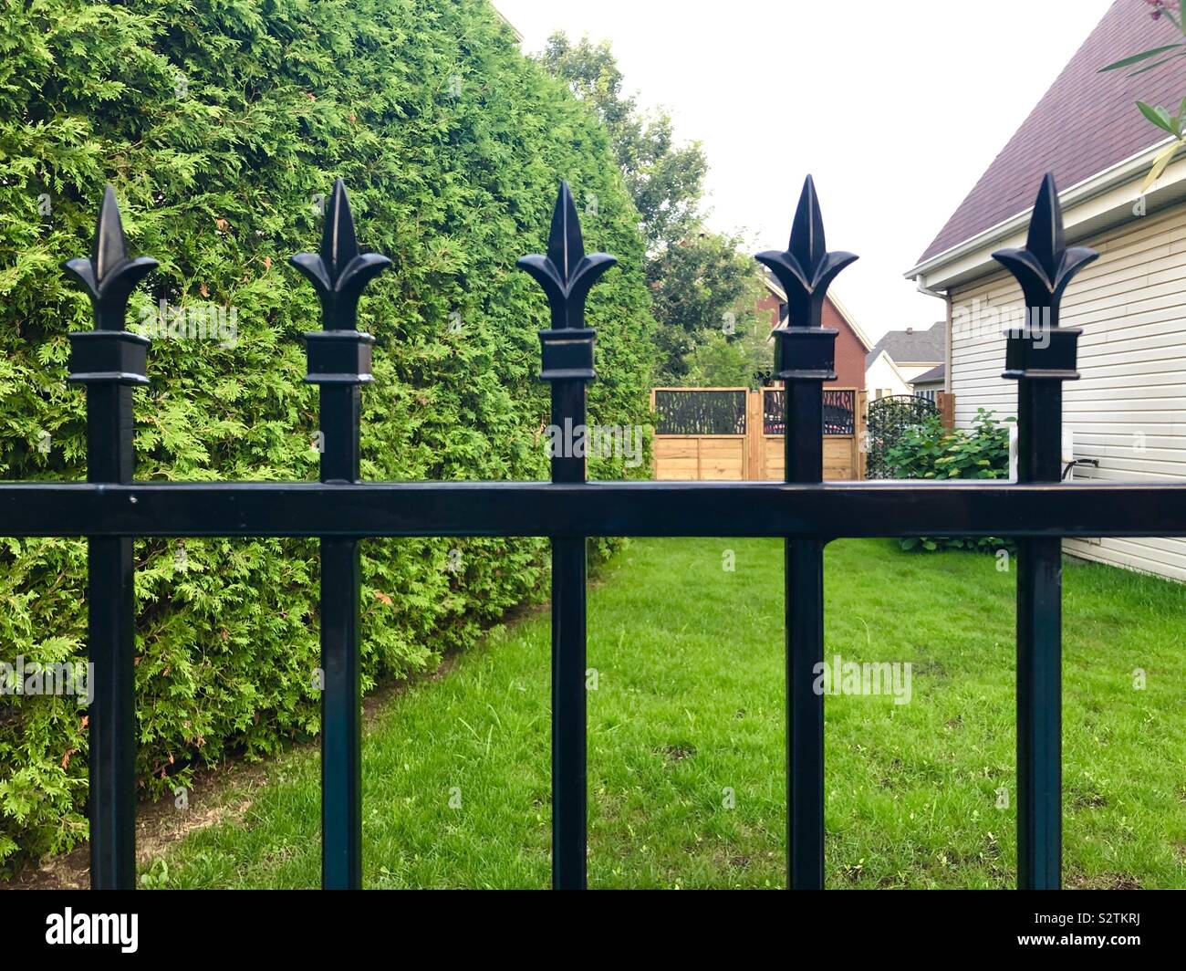 RFS2TKRJ–Black iron fence close-up - grass and houses in background