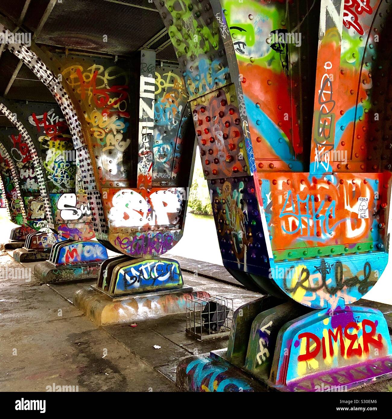 RMS30EM6–Graffiti tagging on steel bridge supports, Vienna, Austria.