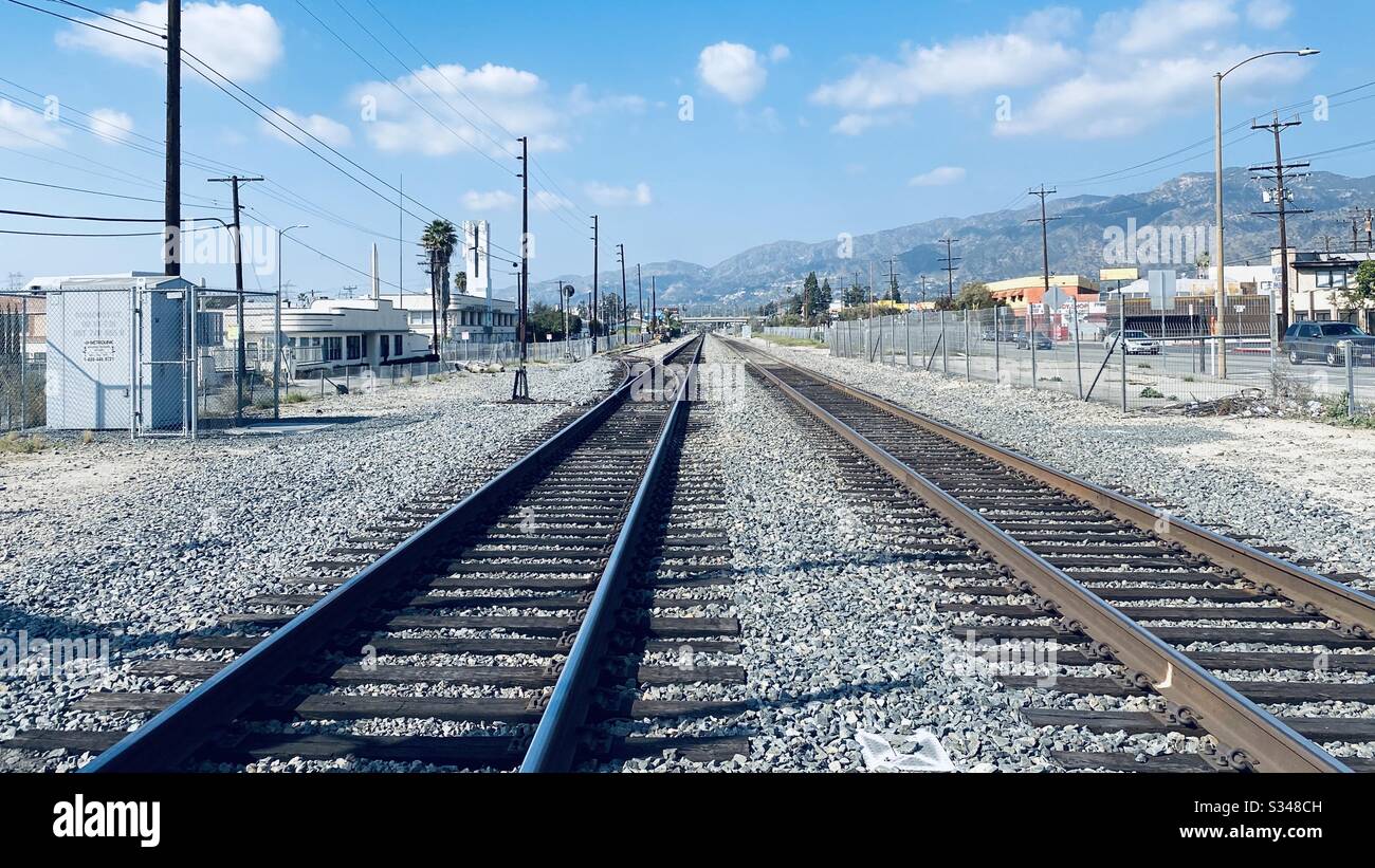 GLENDALE, CA, FEB 2020: railway tracks running towards distant mountains, blue sky with sparse clouds - Smartphone Captured Stock Imagehttps://www.alamy.com/image-license-details/?v=1https://www.alamy.com/glendale-ca-feb-2020-railway-tracks-running-towards-distant-mountains-blue-sky-with-sparse-clouds-image311725025.html