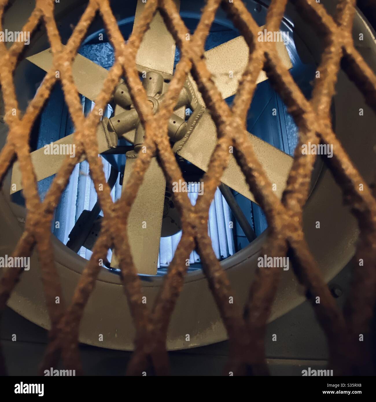 View of an industrial, metal building fan with rusting, iron safety screen in front of it. Amber-hued LED lighting with blue daylight coming from outside - Smartphone Captured Stock Imagehttps://www.alamy.com/image-license-details/?v=1https://www.alamy.com/view-of-an-industrial-metal-building-fan-with-rusting-iron-safety-screen-in-front-of-it-amber-hued-led-lighting-with-blue-daylight-coming-from-outside-image311759120.html
