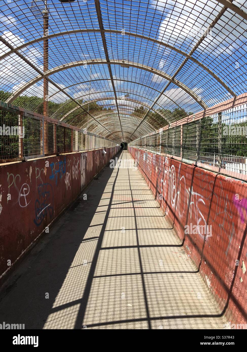 Graffiti and shadows on iron footbridge - Smartphone Captured Stock Imagehttps://www.alamy.com/image-license-details/?v=1https://www.alamy.com/graffiti-and-shadows-on-iron-footbridge-image311802403.html