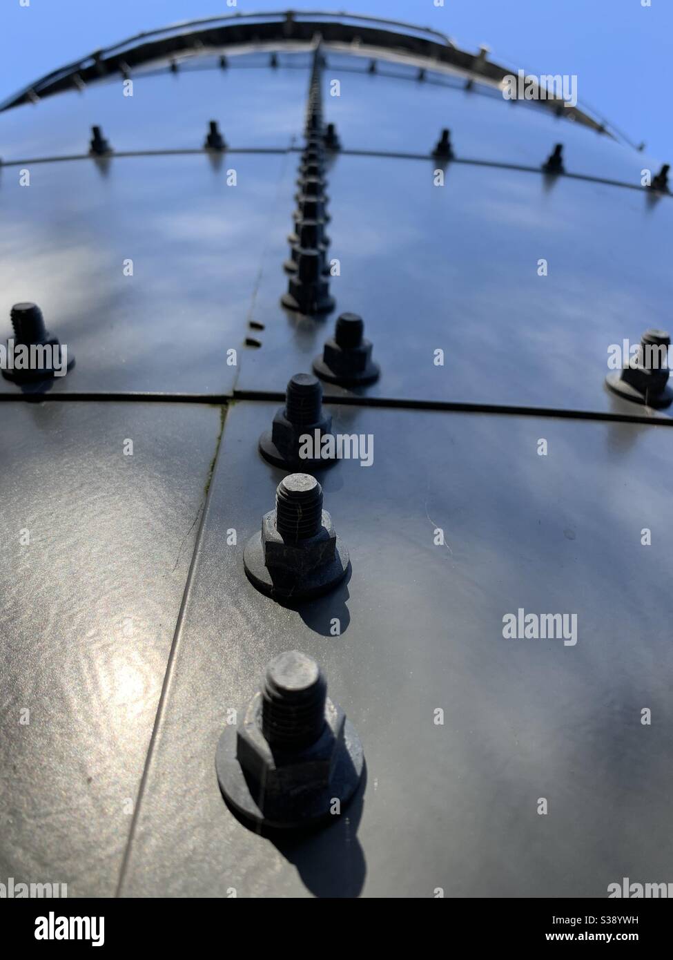 Large heavy iron nuts and bolts protruding from a large painted steel tank - Smartphone Captured Stock Imagehttps://www.alamy.com/image-license-details/?v=1https://www.alamy.com/large-heavy-iron-nuts-and-bolts-protruding-from-a-large-painted-steel-tank-image311828093.html