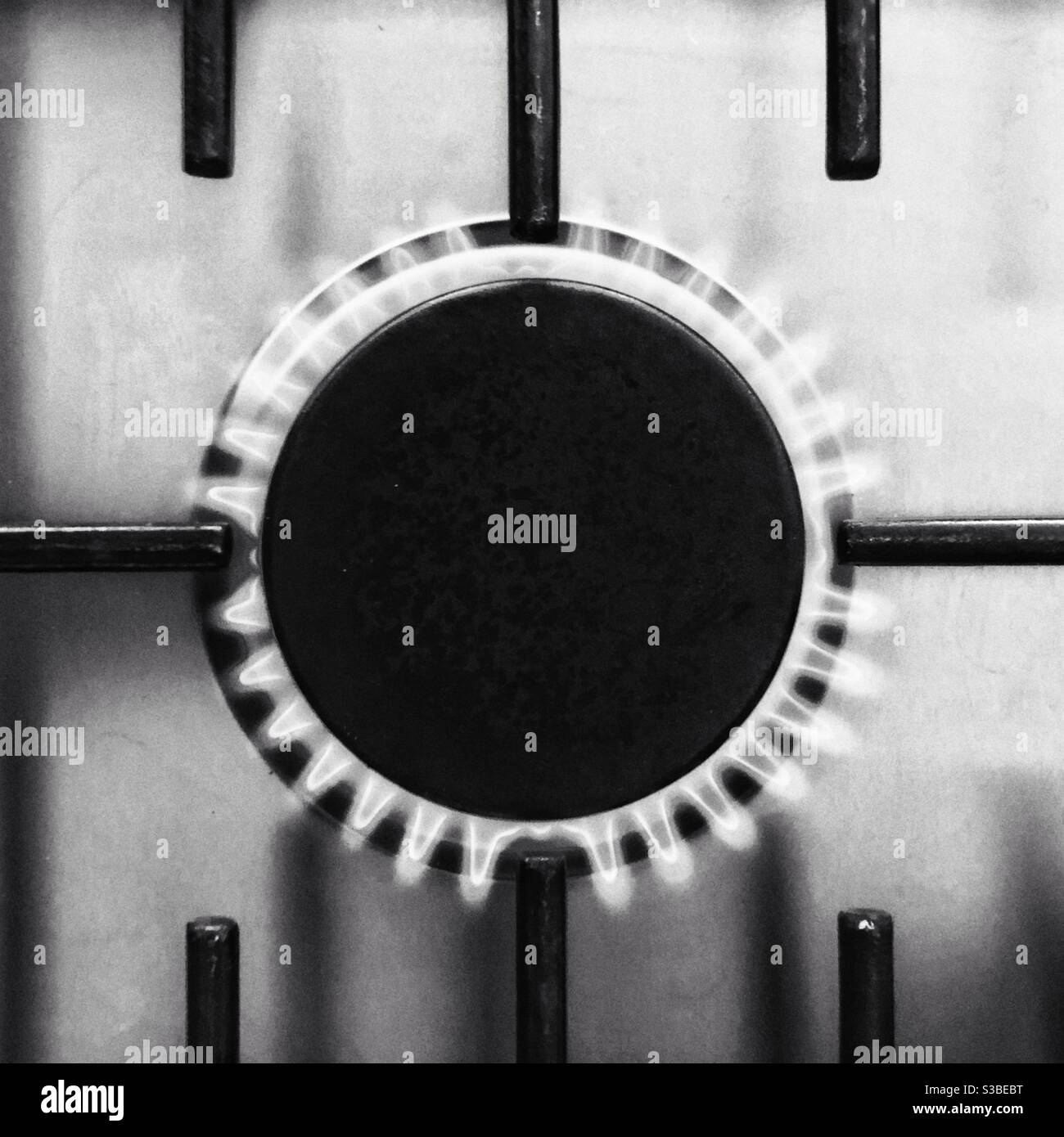 Graphic, high contrast black and white still life of gas hob burner with lit flame from above. - Smartphone Captured Stock Imagehttps://www.alamy.com/image-license-details/?v=1https://www.alamy.com/graphic-high-contrast-black-and-white-still-life-of-gas-hob-burner-with-lit-flame-from-above-image311883372.html