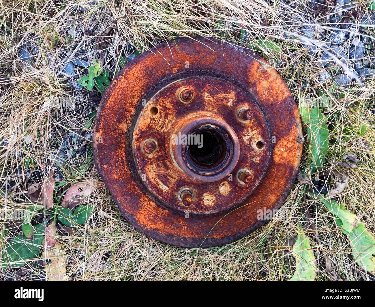 RFS3BJWM–Rusting metal rim discarded outdoors, Nova Scotia, Canada