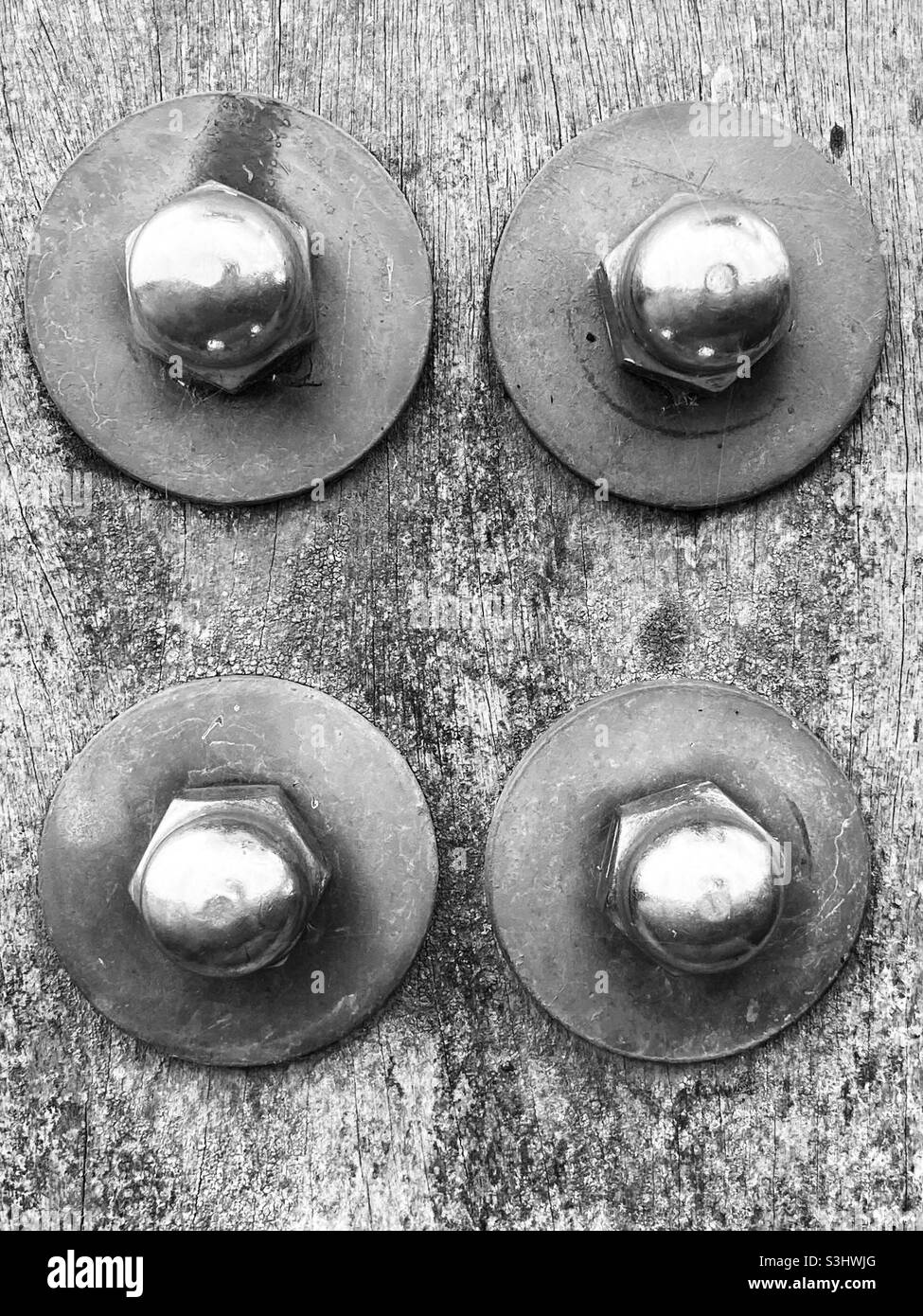RFS3HWJG–four nuts arranged in a square on a weathered wooden beam