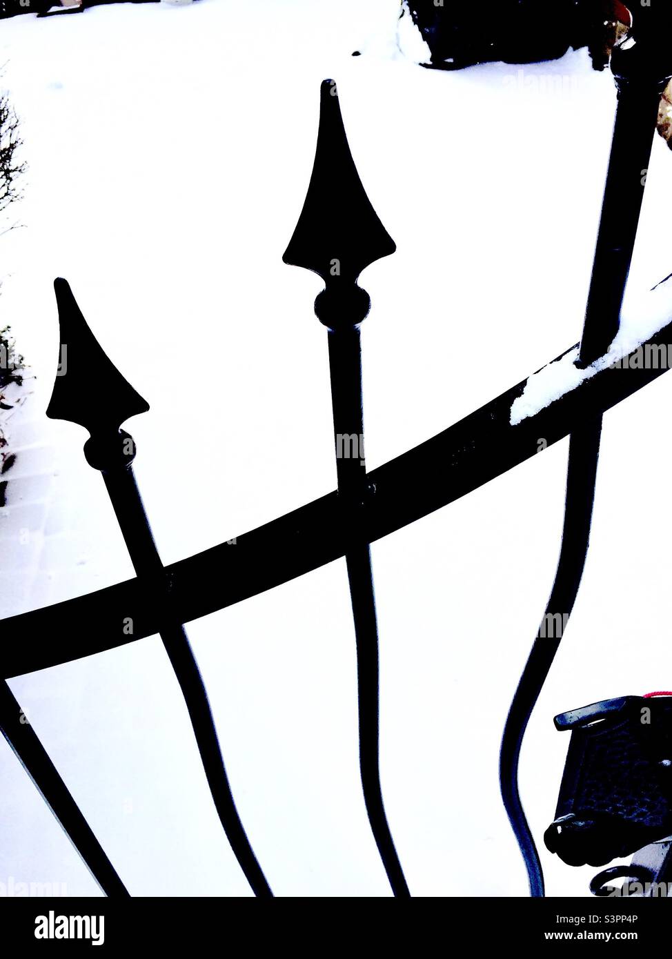 Twisted wrought iron against the backdrop of driven snow, Ontario, Canada. Arrows pointed. Bent, wavy steel. High contrast. Black and White - Smartphone Captured Stock Imagehttps://www.alamy.com/image-license-details/?v=1https://www.alamy.com/twisted-wrought-iron-against-the-backdrop-of-driven-snow-ontario-canada-arrows-pointed-bent-wavy-steel-high-contrast-black-and-white-image312130918.html
