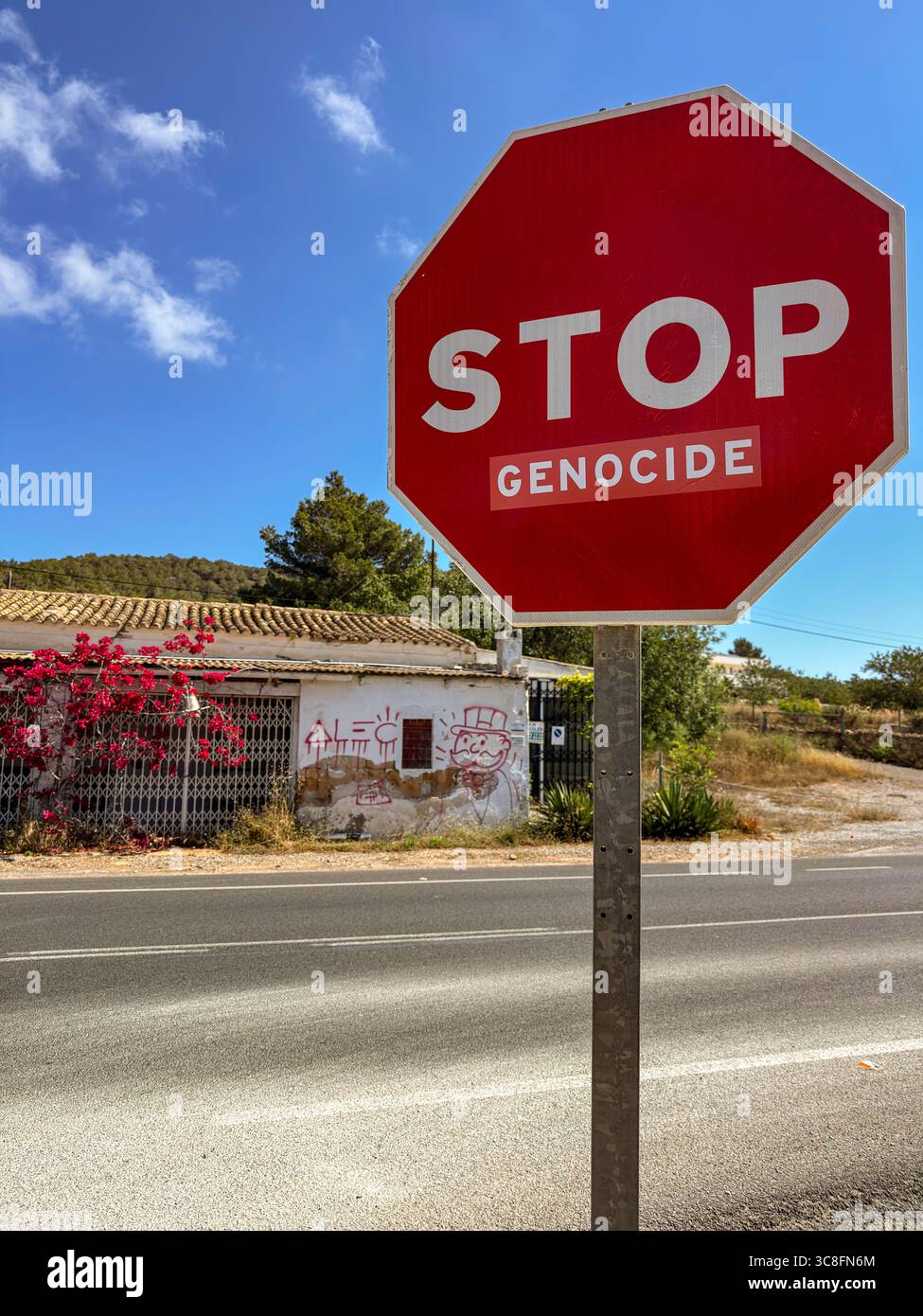 Editorial Image: Protest Sign in Sant Josep de sa Talaia, Ibiza with “STOP Genocide” Political Message: Phillip Roberts - Smartphone Captured Stock Imagehttps://www.alamy.com/image-license-details/?v=1https://www.alamy.com/editorial-image-protest-sign-in-sant-josep-de-sa-talaia-ibiza-with-stop-genocide-political-message-phillip-roberts-image693677900.html