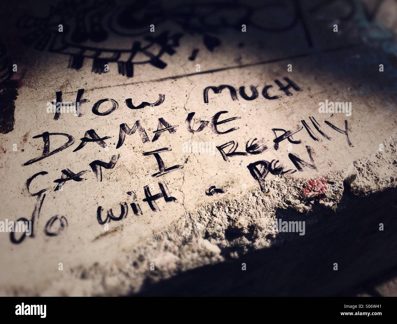 Graffiti on cement reads 'how much damage can I really do with a pen' - Smartphone Captured Stock Imagehttps://www.alamy.com/image-license-details/?v=1https://www.alamy.com/stock-photo-graffiti-on-cement-reads-how-much-damage-can-i-really-do-with-a-pen-309938049.html